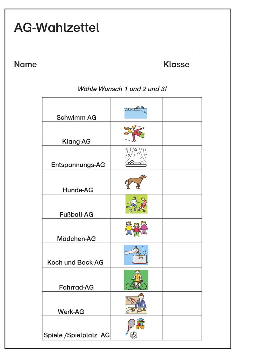 Der Dienstagnachmittag ist der AG-Tag. AGs werden klassenübergreifend angeboten. Es nehmen alle Schüler*innen der Sekundar- und Berufspraxisstufe teil. Die Schüler*innen können jedes Jahr mit einem Wahlzettel eine AG wählen: