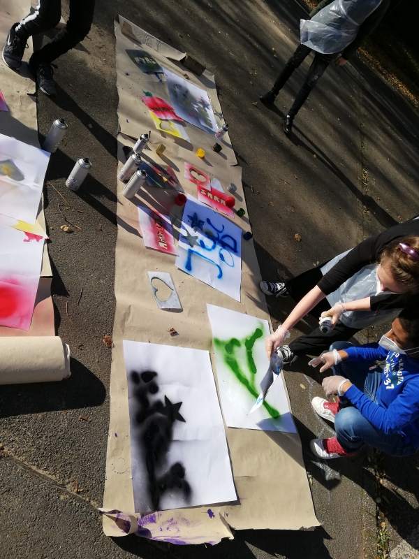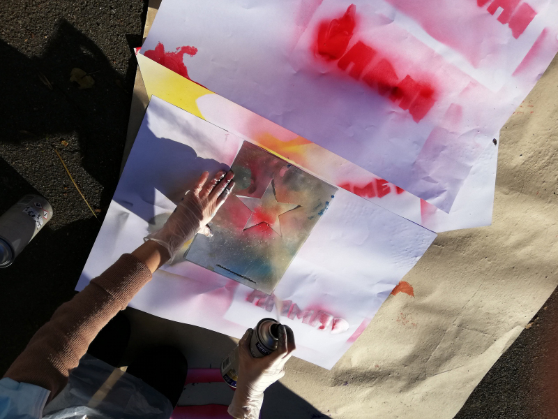 Dann haben wir Schablonen gebastelt. Zum Üben haben wir mit den Schablonen Graffitis mit Sprühkreide gemacht. Wir haben auf Papier und auf den Boden auf dem Schulhof gesprüht. Der Regen hat unsere Kunst wieder weggewaschen.